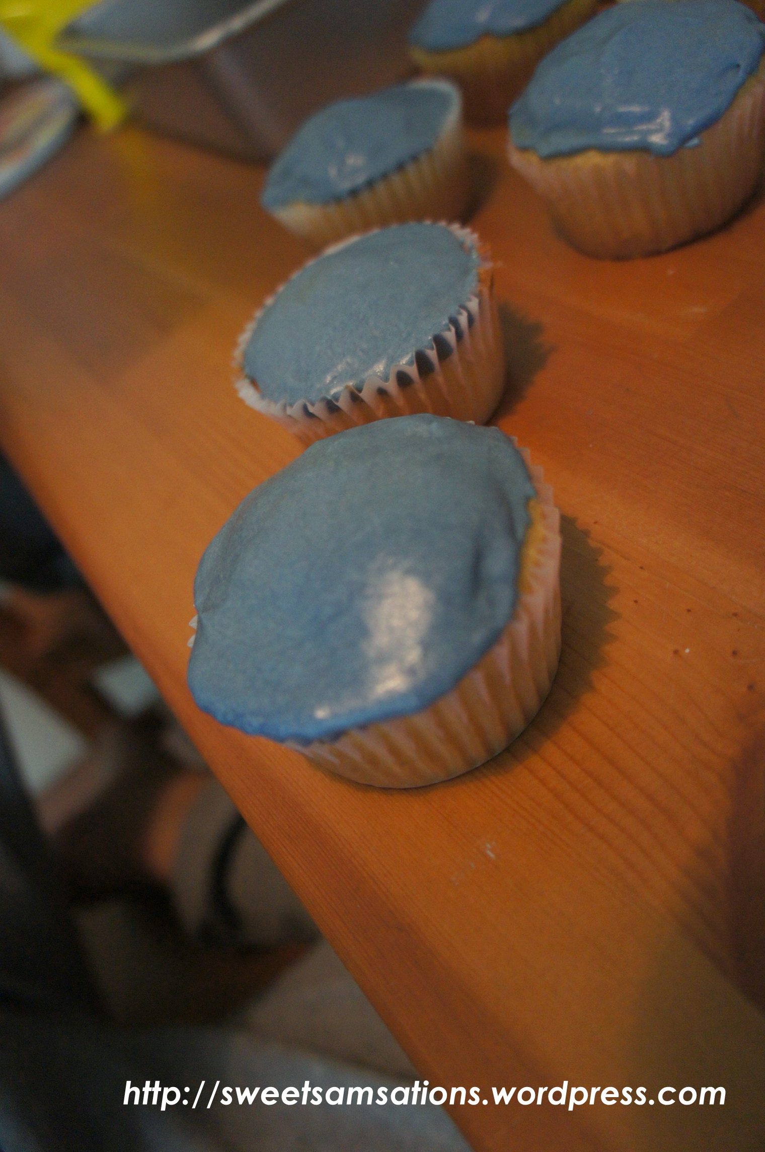 Scoop up a dollop of blue icing and smooth it out using a jam spoon. Repeat on 24 cupcakes.