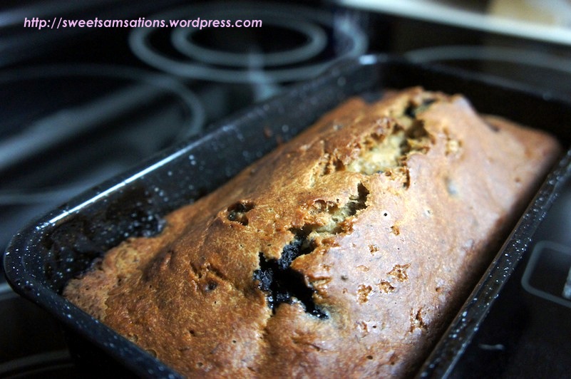 Now, this was actually my 2nd attempt on the banana bread with blueberries. My first attempt was a complete flop! It turned out waaaaay too moist and didn’t look appealing at all! I had also forgotten to coat the pan with my non-stick spray :/