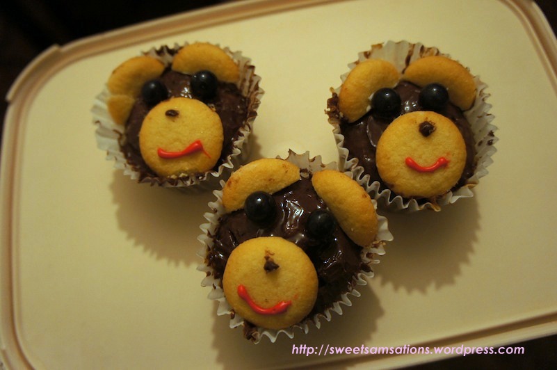 I only had one pair of eyes left and had to resort to using a packet of multi-coloured gumballs that I happened to have in my kitchen. Unfortunately for me, there were only 6 black coloured gumballs in my packet. The gumballs were very hard though, so I wouldn’t recommend them. On one of the monkey, I used some cream from the Oreo Cakesters and rolled it into a ball. I then dabbed on pupils for the monkey with chocolate frosting.