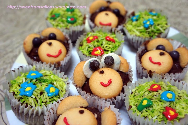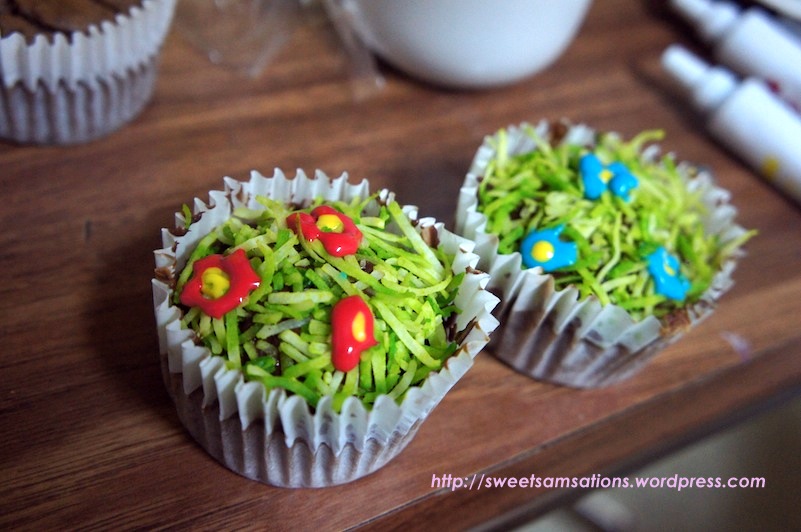 2) Play around with your icing pens! Put flowers / butterflies whatever your creativity makes of you! I drew flowers on my grass and they were simpler. Have fun with the different colours you have! Refrigerate each muffin after completion to avoid having the icing melt or smudge. Remember that the muffin is not entirely flat and its spherical top surface can actually cause the icing to slide downwards if not refrigerated immediately.