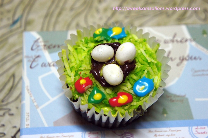 Use sprinkle dyed shredded coconuts on the remainder of the cupcake