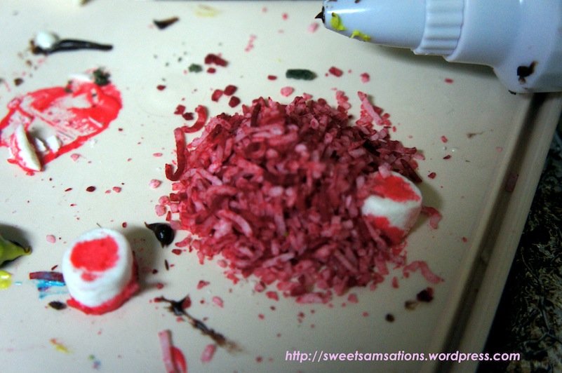 Green frosting and green shredded coconut