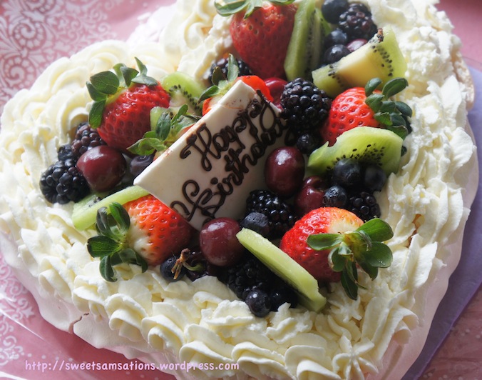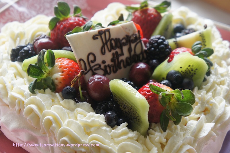 Sam, you did a super amazing job! This cake is gorgeous and I think a perfect birthday treat! I bet it was uber delicious too. I’ve never had pavlova but just looking at your pics, I wanna go out and try it right now!