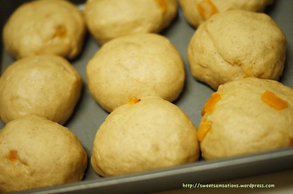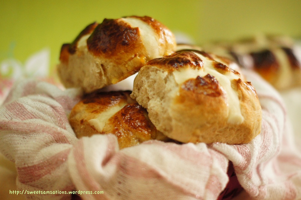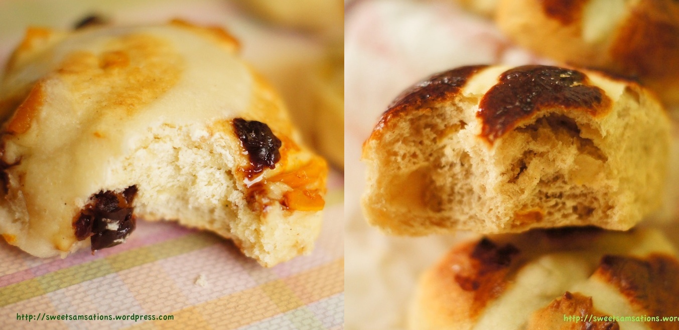 I compared two recipes; allrecipes and Good Housekeeping Cookbook – Classic Home Cooking, then decided to add some tropical flavour of my own!! When I first saw that Hot Cross Buns were this month’s challenge by The Little Loaf for Fresh From the Oven, I was pretty excited about it! Unfortunately, I am really not the biggest fan of currants / raisins and any addition of it would bear severe reluctance. Sorry guys! But all is not lost! Alas, we still have other alternatives to dried fruits, like CHERRIES and MANGOS! I made both, but I’m only going to post up the recipe for the mango one which I thought was softer and prettier! The “cherry + mango combination” ones tasted really good too but that recipe yielded a more scone-like texture instead of the soft, fluffy texture I was looking for. If you like, you could add 1/3 cup to these soft and fluffy tropical hot cross buns 🙂