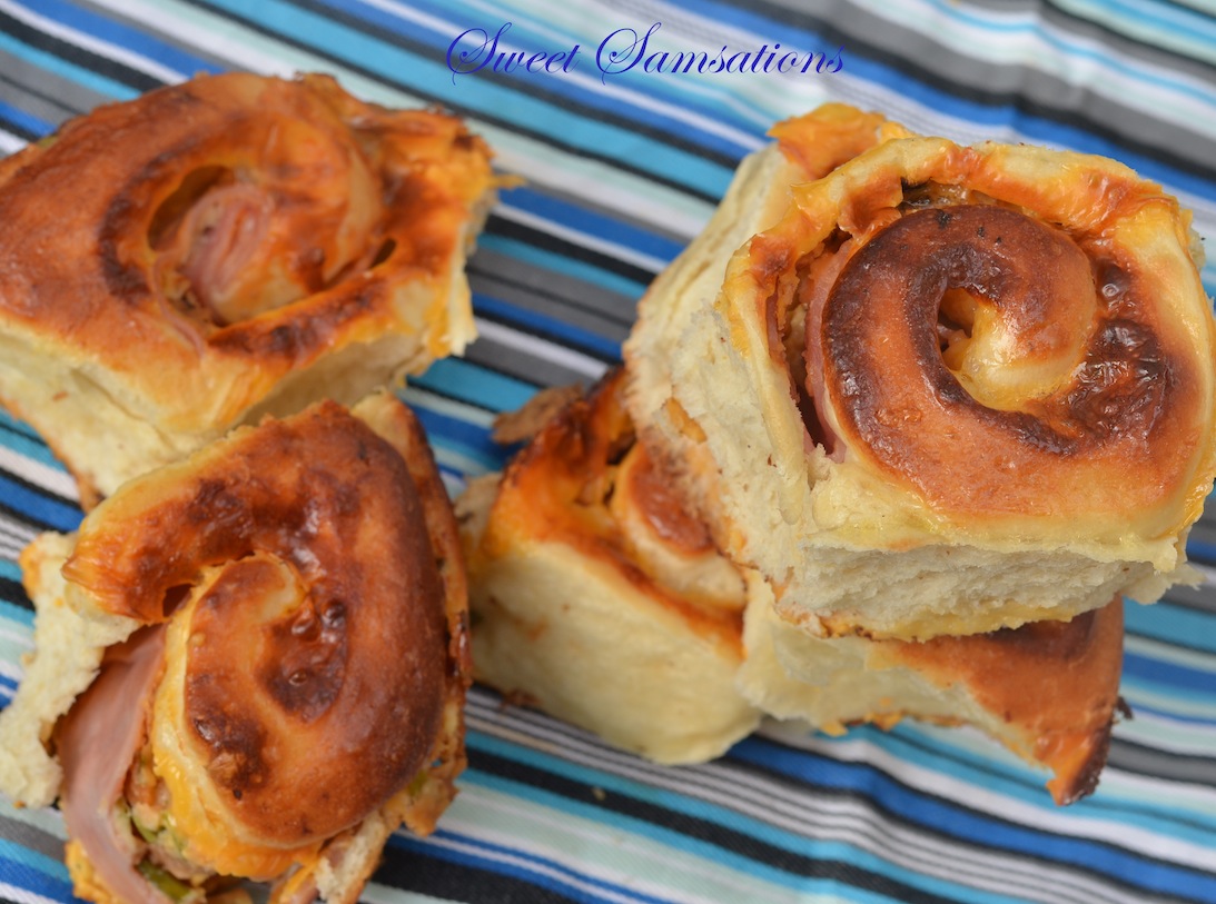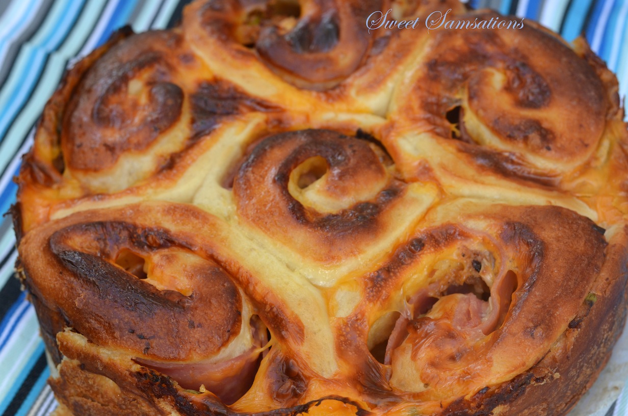 - Turn dough out onto a lightly floured surface, roll into a 12×9 inch rectangle. For the filling, I layered it with 8 slices of ham, 8 cheddar cheese slices, mayo, green onions, another 8 slices of ham and shredded cheese. Starting at long side, tightly roll up, pinching seam to seal. With serrated knife, cut into 8 pieces; place cut side down, in prepared pan. Cover and let rise for 1 hour or until doubled in volume. Meanwhile, preheat oven to 350 degrees F.